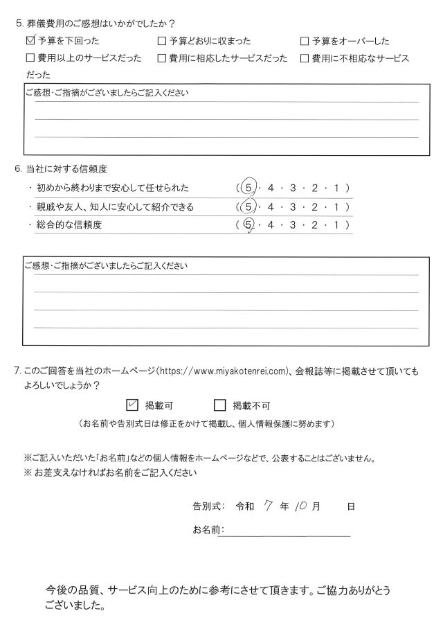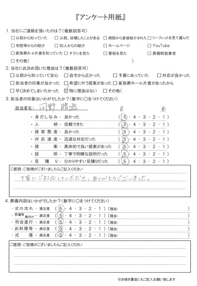 葬儀・家族葬は都典礼世田谷店では満足度向上ため、お客様にアンケートへのご協力をいただいております。以下が実際に書いていただいたアンケートです。