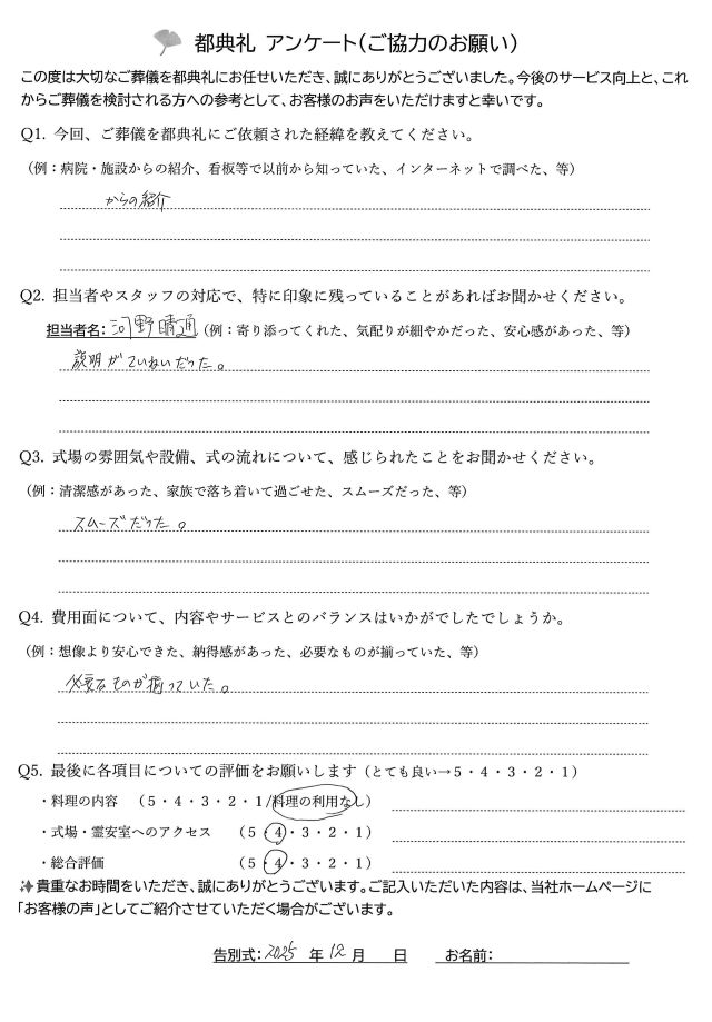 葬儀・家族葬は都典礼世田谷店では満足度向上ため、お客様にアンケートへのご協力をいただいております。以下が実際に書いていただいたアンケートです。